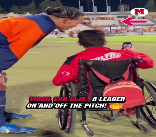 温馨时刻!范迪克来到场边与坐轮椅的球迷合影,并为其签名